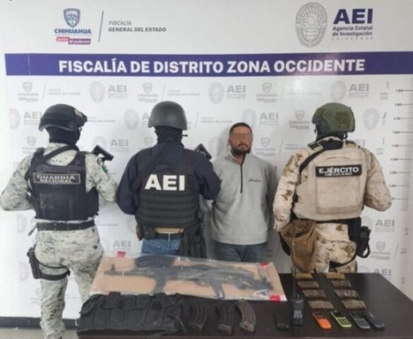 La detención en flagrancia de Fernando F. C.El Cuervo”, se efectuó tras un operativo en el que participaron elementos de Agencia Estatal de Investigación, Guardia Nacional y Ejército Mexicano, acción en la que le aseguraron un arma larga calibre 7.62x39mm, tres cargadores, equipos de radiocomunicación y una camioneta Dodge Ram, color gris, modelo 2013 con reporte de robo.