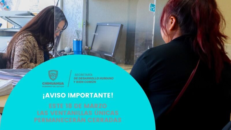 Chihuahua, Chih.- La Secretaría de Desarrollo Humano y Bien Común (SDHyBC) anunció que con motivo de la conmemoración del natalicio de Benito Juárez, mañana lunes 18 de marzo permanecerán cerradas las Ventanillas Únicas en los municipios de Chihuahua, Nuevo Casas Grandes e Hidalgo del Parral.