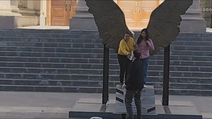 A la llegada a Palacio de Gobierno el secretario general, Santiago de la Peña Grajeda, fue arribado por parte de dos ciudadanas, quienes contrario a solicitarle algún tipo de apoyo o gestión por parte del funcionario estatal le pidieron que les tomara una fotografía en la escultura de alas que se encuentra frente a la puerta del inmueble en la calle Libertad.