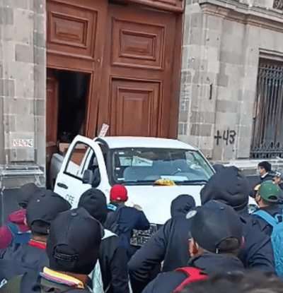 Los normalistas utilizaron una camioneta de la Comisión Federal de Electricidad (CFE)para derribar la puerta Mariana 2 de Palacio Nacional, pero fueron repelidos por elementos de la Policía Militar usando gases lacrimógenos.