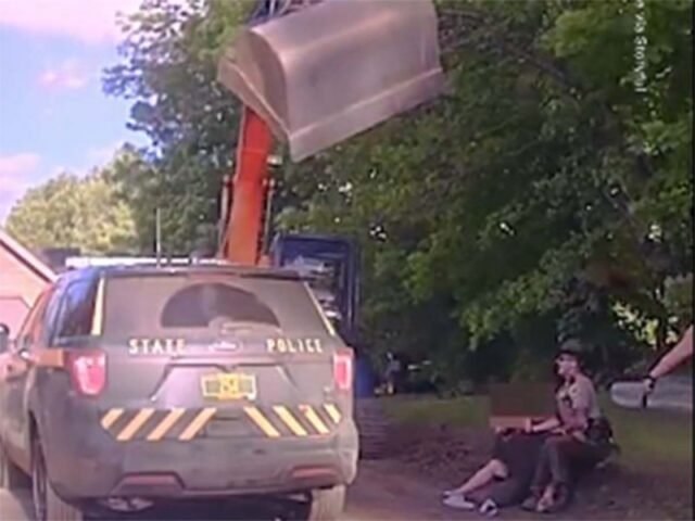 Testigos de los hechos indicaron que los policías intentaron detener a Brandon Tallman, un joven de 24 años de edad, pero no contaban con que el papá del detenido los atacaría usando una máquina excavadora.