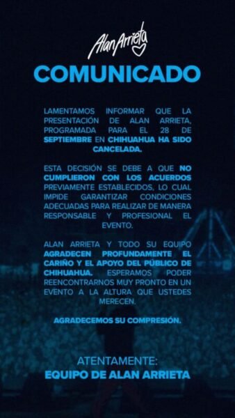 “Lamentamos informar que la presentación de Alan Arrieta, programada para el 28 de septiembre en Chihuahua, ha sido cancelada.