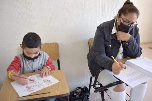 Araceli Rodríguez Vázquez, de 51 años y quien es originaria de Ciudad Juárez, en compañía de su nieto de 3 años, acudió a presentar los exámenes de secundaria durante la Tercera Jornada Nacional de Acreditación INEA, que realiza en el estado el Instituto Chihuahuense de Educación para los Adultos (ICHEA).