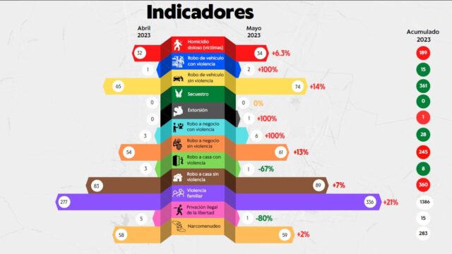 En el acumulado anual de enero a mayo del 2023, los delitos que aumentaron en su línea de referencia fueron el homicidio doloso con 189 hechos, extorsión, con una denuncia presentada; robo a negocio sin violencia con 245 denuncias, además de robo a casa sin violencia que acumuló 360 denuncias en este periodo.
