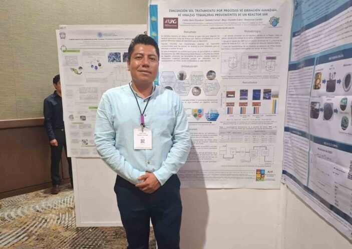 El profesor-Investigador, adscrito al Departamento de Biotecnológicas y Ambientales presentó el trabajo “Evaluación del tratamiento por procesos de oxidación avanzada de vinazas tequileras provenientes de un reactor SBR”, un estudio realizado en el laboratorio de Procesos Químicos Sostenibles (PQS) de la UAG a su cargo, donde participaron estudiantes de las carreras de Ingeniería Química e Ingeniería en Biotecnología.