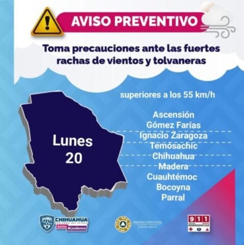 Los vientos pueden presentarse en Cuauhtémoc, Chihuahua, Santa Isabel, Nonoava, Balleza, El Tule, Bocoyna, Guachochi, Ascensión, Casas Grades y Nuevo Casas Grandes, los cuales pueden oscilar entre los 85 y 55 km/h.