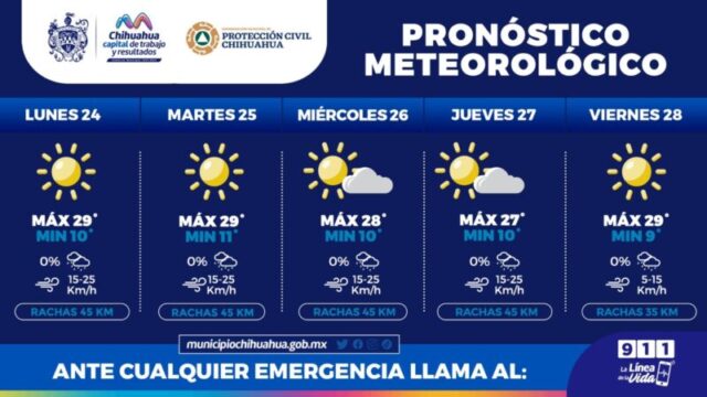 Chihuahua, Chih.- La Coordinación Municipal de Protección Civil, informa a la población que, para la semana del 24 al 28 de abril, se pronostican temperaturas máximas de 29°C, así como mañanas y noches frescas con mínimas de hasta 9°C.