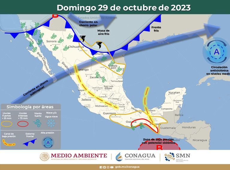 Además, la intensa masa de aire frío asociada al frente, ocasionará a partir de la madrugada del lunes la caída de nieve, aguanieve o lluvia engelante en municipios de las regiones norte y serrana del estado.