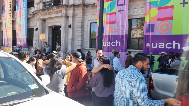 CHIHUAHUA.- Un grupo de estudiantes y docentes de la Facultad de Zootecnia de la UACH realizó una protesta frente a Rectoría para denunciar las amenazas que la maestra Diana González ha recibido para que abandone su candidatura a la Dirección. Exigieron respeto a la autonomía universitaria.