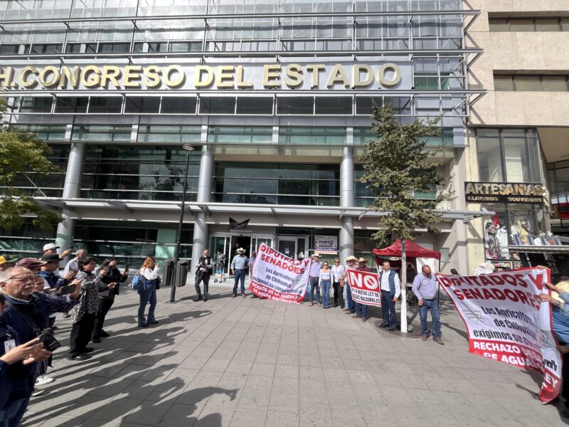 La Organización de Agricultores Unidos de Chihuahua se manifestó en el Congreso del Estado, donde denunció que la nueva ley de aguas elimina la certeza jurídica para los productores.