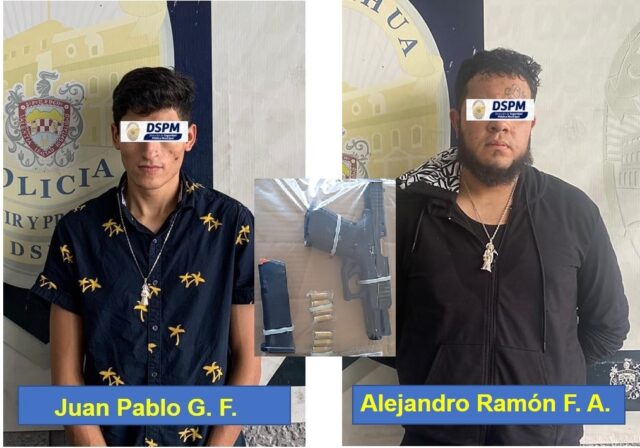 Los detenidos identificados como Alejandro Ramón F. A. y Juan Pablo G. F., de 26 y 19 años de edad, se transportaban a bordo de un auto VW de la línea Vento con placas nacionales, que fue asegurado junto con un arma de fuego calibre 9 MM que se encontraba abastecida con 9 cartuchos útiles para ponerla a disposición del Ministerio Público junto con los detenidos y el auto e integrar la carpeta de investigación correspondiente y deslindar responsabilidades, así como determinar si los supuestos delincuentes cuentan con antecedentes por otro tipo de delito.