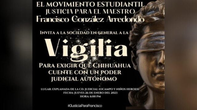 Mediante redes sociales, el Movimiento Estudiantil Justicia para el Maestro Francisco González Arredondo invitó a la sociedad en general a reunirse este 26 de enero en la explanada de la Ciudad Judicial, ubicada entre la calle Ocampo y avenida Niños Héroes, para «exigir que Chihuahua cuente con un poder judicial autónomo».