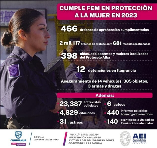Chihuahua, Chih.- De enero a diciembre del 2023, elementos de la Agencia Estatal de Investigación adscritos a la Fiscalía de la Mujer en la Zona Centro, realizaron un total de 55 mil 222 diligencias en apoyo a las unidades de investigación de los delitos de género.