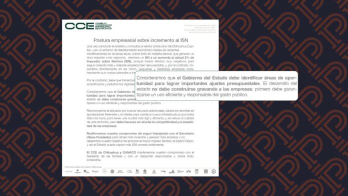 El Consejo Coordinador Empresarial y la Canaco en Chihuahua, emitieron su postura en la que rechazó un aumento al Impuesto sobre Nómina porque consideró que habría impactos directos en los costos laborales de las micro, pequeñas y medianas empresas.