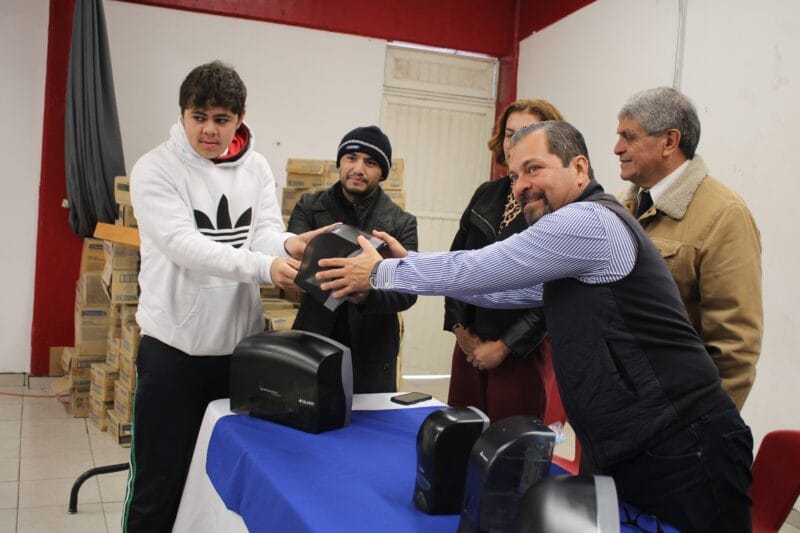 Un total de 14 escuelas secundarias y primarias estatales de Ciudad Juárez fueron beneficiadas con la donación de insumos para sanitarios, entre ellos dispensadores para jabón y papel higiénico.