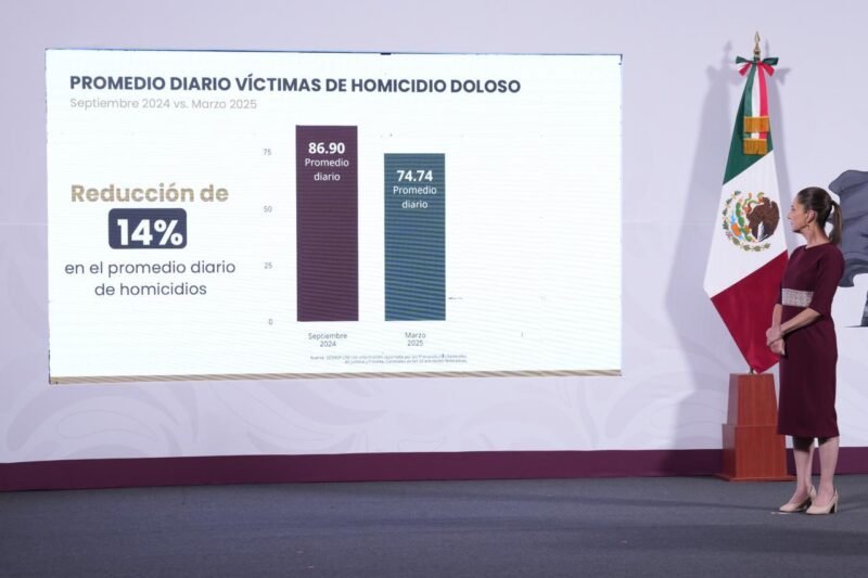 La titular del Secretariado Ejecutivo del Sistema Nacional de Seguridad Pública, Marcela Figueroa Franco, informó que durante los primeros seis meses de la administración de la presidenta Claudia Sheinbaum, se observó una tendencia mensual a la baja en el promedio diario de víctimas de homicidio doloso. En septiembre de 2024 se registró un promedio de 86.9 víctimas diarias, mientras que en marzo de 2025 el promedio fue de 74.7, lo que representó una disminución del 14 por ciento.