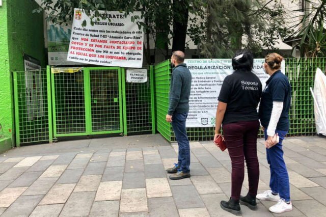 Ciudadanos leen una denuncia colocada sobre la entrada del Centro de Salud T-III "Atanasio Garza", en la que se expresa que el personal de salud se encuentra contagiado de covid-19 ante la falta de equipo de protección y uniformes, en la alcaldía Cuauhtémoc, Ciudad de México, el 6 de julio de 2022. Foto Luis Castillo© Proporcionado por La Jornada Ciudadanos leen una denuncia colocada sobre la entrada del Centro de Salud T-III «Atanasio Garza», en la que se expresa que el personal de salud se encuentra contagiado de covid-19 ante la falta de equipo de protección y uniformes, en la alcaldía Cuauhtémoc, Ciudad de México, el 6 de julio de 2022. Foto Luis Castillo