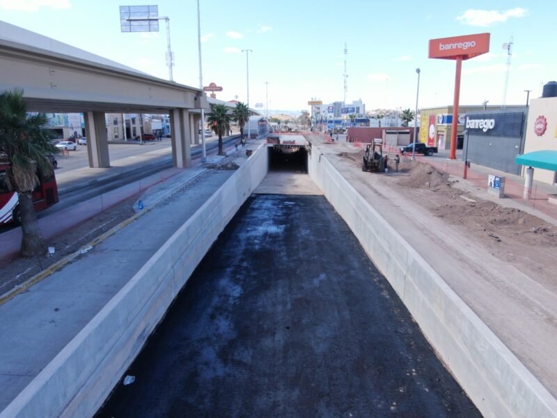 Actualmente se encuentran trabajando en la conformación de los muros de concreto reforzado, así también como en banquetas y guarniciones. Además, se realiza el riego de impregnación, la base para el tendido de la carpeta asfáltica final del paso inferior.