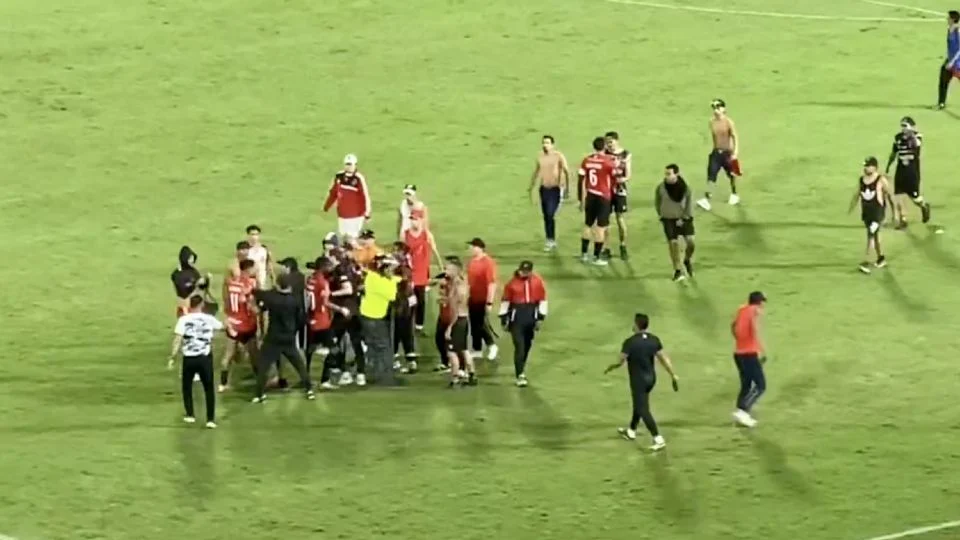 La situación que rápidamente sale de control obligó al árbitro a suspender el partido de manera indefinida. Ante la llegada de más aficionados, los jugadores corren a resguardarse en sus vestuarios y son perseguidos, creando un caos en la cancha.