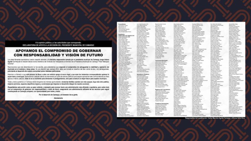 Tras el despido de 106 empleados sindicalizados del municipio de Camargo y las manifestaciones lideradas por diputados morenistas que solicitaron la intervención del Gobierno del Estado, cerca de 500 personas expresaron su respaldo al alcalde Jorge Aldana Aguilar mediante un desplegado público.