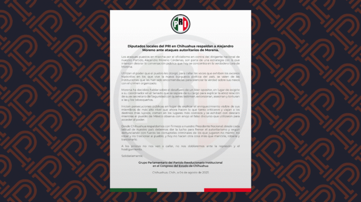 Los diputados locales del Partido Revolucionario Institucional (PRI) en Chihuahua manifestaron su respaldo al dirigente nacional, Alejandro Moreno Cárdenas, ante los ataques que calificaron de autoritarios por parte del partido Morena.
