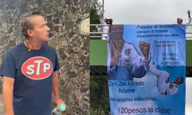 El cartel gigante estaba ilustrado por la edición del «Zen zei Alfredo Adame«, con su traje de karate e iba acompañado de la leyenda «Clases de Karate y DJ, no aceptes imitaciones, 120 pesos la clase«.
