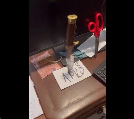 “Acabo de llegar a mi casa y este es el panorama que encuentro en mi despacho, vean ustedes, tiradas todas las cosas útiles y además se roban una pequeña laptop que tenía yo a un lado pero lo peor es que vean lo que me deja: Un cuchillo y abajo los signos del señor mandante putrefacto”, denunció el comunicador.