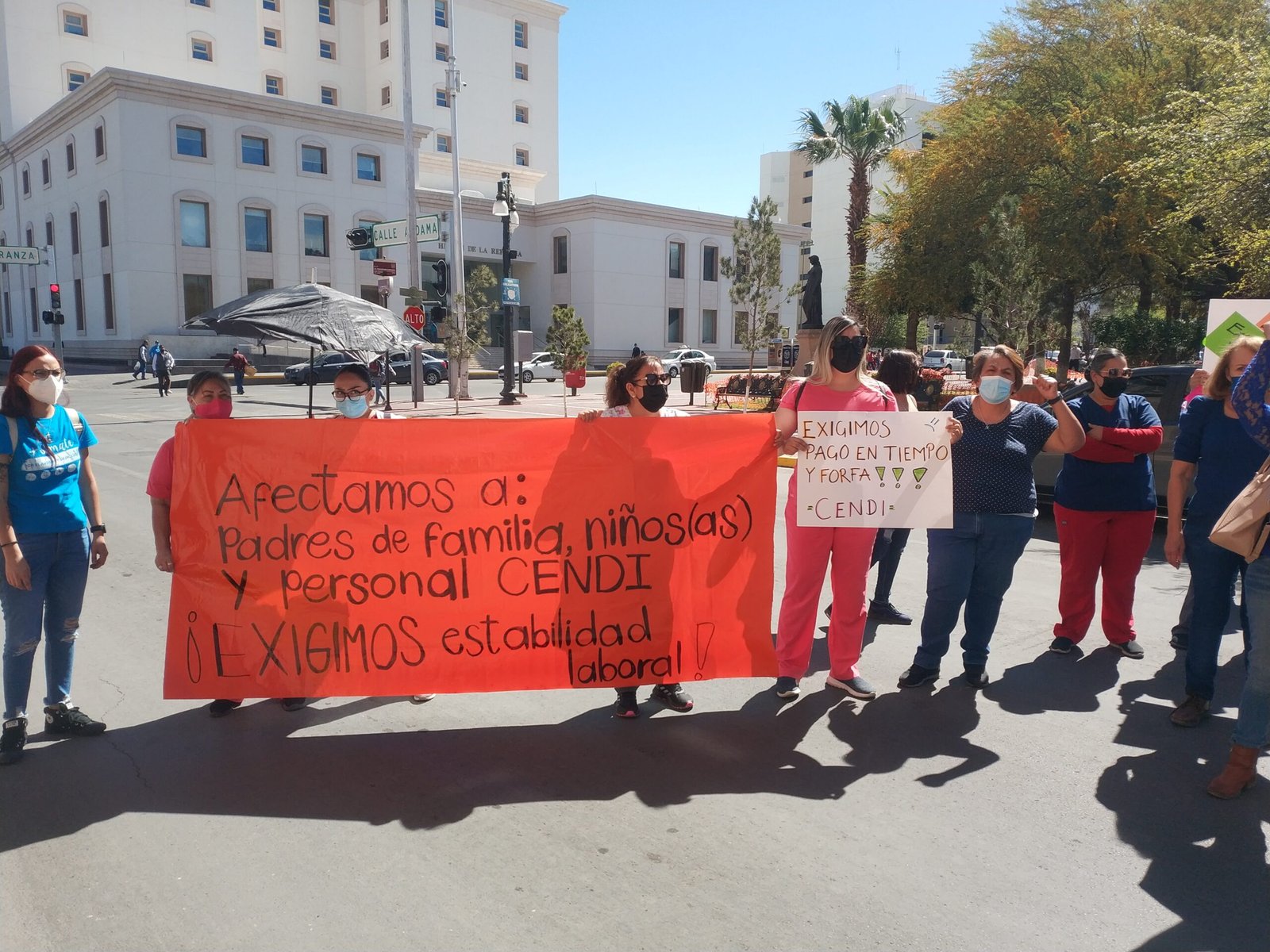 Un grupo de mujeres manifestantes que forman parte de los Centros de Desarrollo Infantil se presentaron ante la calle Aldama frente a Palacio de Gobierno para exigir pagos de nómina y diversas otras exigencias a las autoridades.