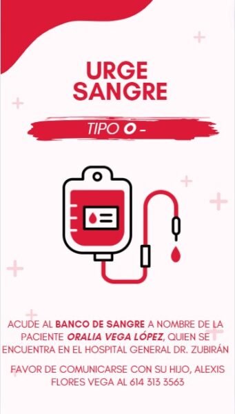 Familiares y amigos de Oralia Vega López solicitan a la comunidad para la donación de sangre tipo O Negativo, a fin de poderla ayudar, ya que se encuentra actualmente internada en el Hospital General “Dr. Salvador Zubirán Anchondo” en la ciudad de Chihuahua.