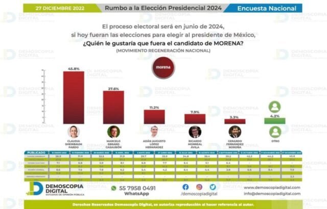 Ciudad de México.- Luego de siete meses de crecimiento sostenido, la Jefa de Gobierno de la Ciudad de México, Claudia Sheinbaum Pardo, se muestra al cierre del presente año como la más firme aspirante para la sucesión presidencial del 2024. Lo anterior según el estudio publicado este 27 de diciembre por la firma Demoscopia, donde la titular del gobierno capitalino revela un incremento de sus preferencias de más de 16 puntos porcentuales, pasando de 29.7% en el mes de mayo al 45.8% durante el presente mes.