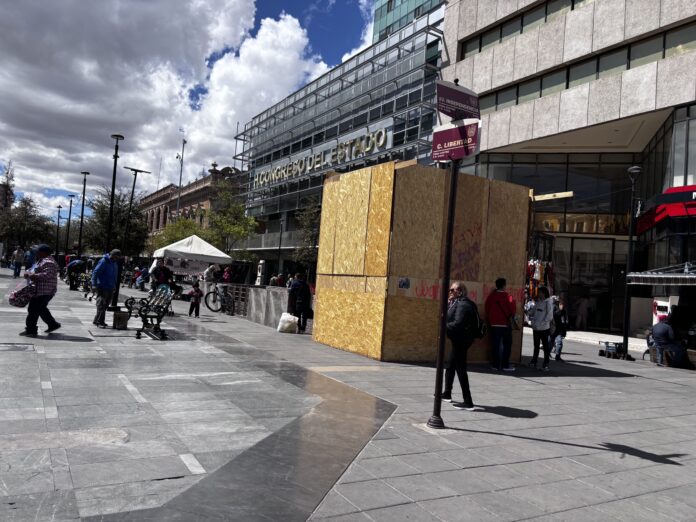 El equipo fue cubierto con estructuras de madera como parte de las medidas implementadas ante las marchas feministas realizadas el pasado 8 de marzo. Sin embargo, pese a que las movilizaciones ya finalizaron, las mamparas permanecen en el lugar, lo que impide el uso del elevador.