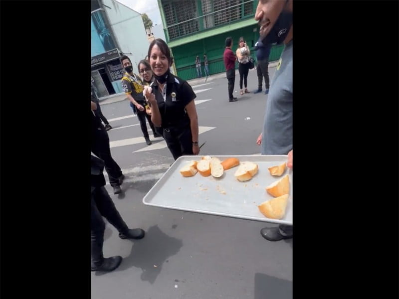 Las personas que observan al hombre regalar pan, se ríen, pero igual aceptan un pedazo para aplicar aquella que frase de las abuelitas que decía: “cómanse un pan pal susto”. Incluso, el joven que graba el video también estira la mano para alcanzar un trozo de bolillo.