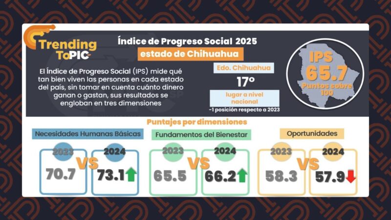 El Índice de Progreso Social 2025 difundido por Plataforma de Inteligencia Competitiva del Sector Privado (PICsp), informó que Chihuahua alcanzó 65.7 puntos y superó el resultado de 64.8 obtenido en 2023, lo que representó un incremento en el desempeño general del estado.