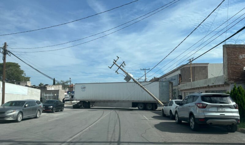 El percance ocurrió en la intersección de la calle 23 y la privada de José Eligio Muñoz, cuando un camión de transporte de materiales de la empresa Chuntaros Trucking, procedente de Ciudad Juárez, se enredó con el cableado al realizar una maniobra.