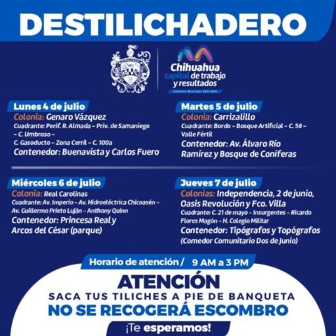 CHIHUAHUA, CHIHUAHUA.- El Gobierno Municipal, a través de la Dirección de Servicios Públicos Municipales, informa a la ciudadanía el calendario que el programa Destilichadero tendrá del 4 al 7 de julio, donde visitará seis colonias de la ciudad, de 9 de la mañana a 3 de la tarde.
