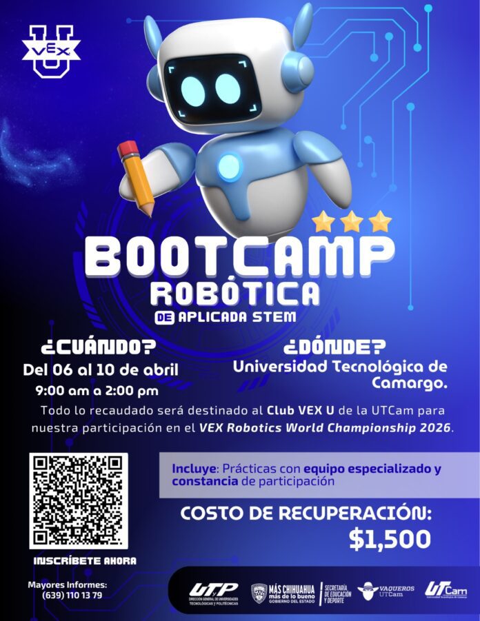 El bootcamp se realizará del 6 al 10 de abril en las instalaciones de la Universidad Tecnológica de Camargo, con horario de 9:00 de la mañana a 2:00 de la tarde. El curso será impartido por estudiantes que forman parte del Club VEX Robotics de la institución, quienes además representarán a la universidad en el VEX Robotics World Championship 2026, una de las competencias más importantes de robótica a nivel internacional.