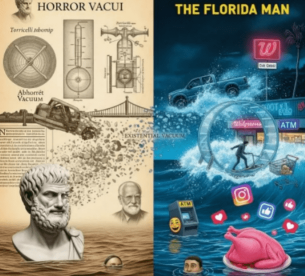 Un grito silencioso atraviesa los siglos: desde las aulas de Atenas donde Aristóteles advertía que el hombre sin propósito cae en la apatheia, la indiferencia que mata el alma, hasta los titulares de Florida donde un tipo desnudo pelea contra un cocodrilo en un Walmart a las 3 de la mañana porque “necesitaba sentir algo”, el vacío existencial muta, pero nunca desaparece; solo se viste de metanfetamina y tatuajes de Bob Esponja.