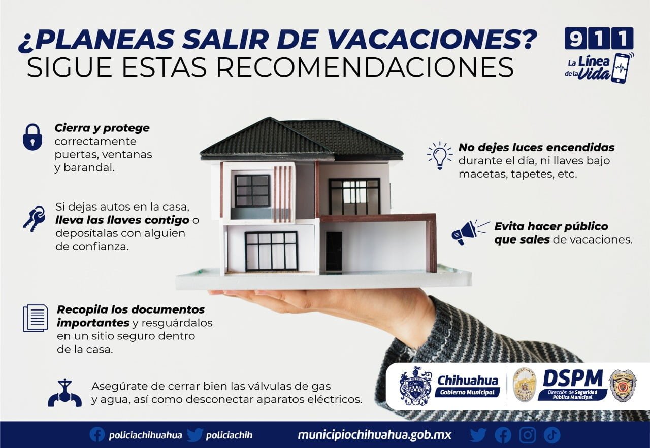 La Dirección de Seguridad Pública Municipal de Chihuahua, a través de la Subdirección de Justicia Cívica y Prevención, recuerda a quienes saldrán de vacaciones, tomar medidas básicas antes de dejar sus casas solas, pues además de la vigilancia preventiva que mantiene la DSPM en las diferentes colonias, es importante que la población colabore tomando ciertas medidas de autocuidado.