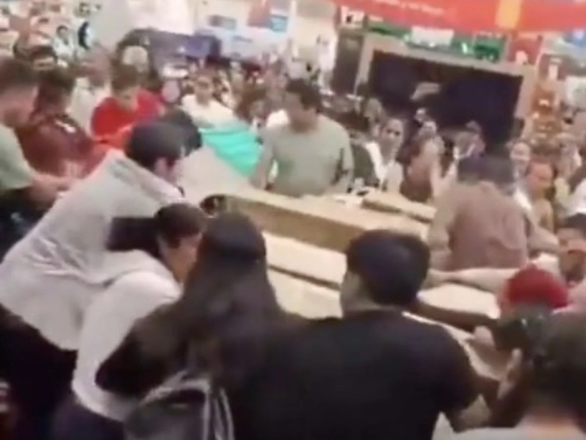 Tras los empujones, dos hombres se enfrascan más allá de la discusión y comienzan a golpearse en medio del tumulto de la gente. Aunque un trabajador de la tienda intenta detener el hecho violento, los sujetos hacen caso omiso.